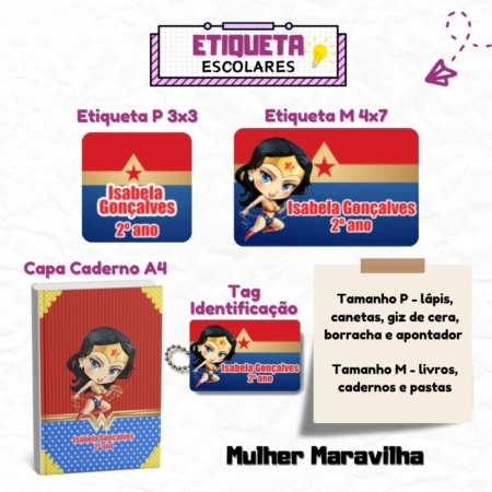 • Kit Etiquetas Escolares Mulher Maravilha Personalizadas