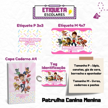 • Kit Etiquetas Escolares Patrulha Canina Menina Personalizadas